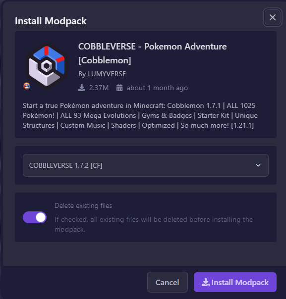 You’ll see a toggle like Delete existing files. This controls whether the panel wipes your current server directory before installing the pack.
