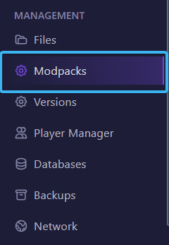 In your server’s left sidebar, go to Management → Modpacks. This is where you can browse and install supported packs directly from the panel.